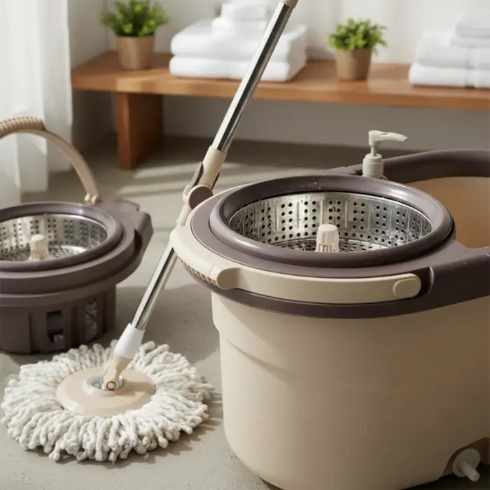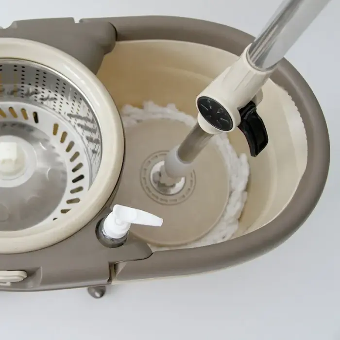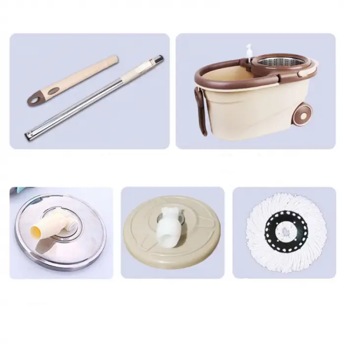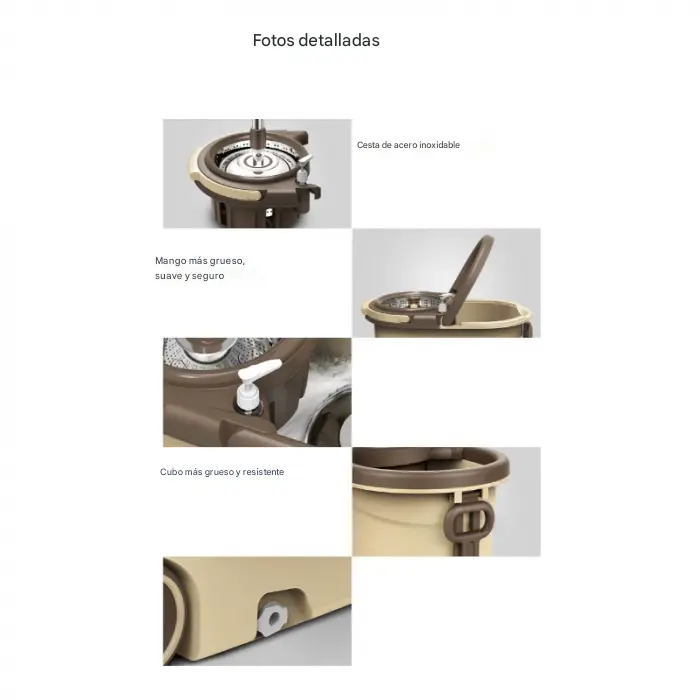 Posee ruedas y manija transportadora, tapón de desagote Incluye 2 mopas lavables Medidas: balde 45,5cm x 25,5cm x 21,5cm Color: Blanco con gris y beige con marrón SE ENTREGA SURTIDO